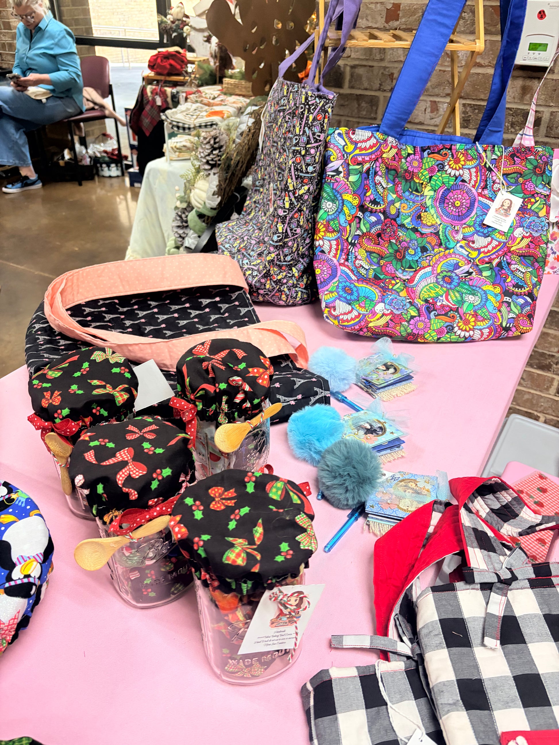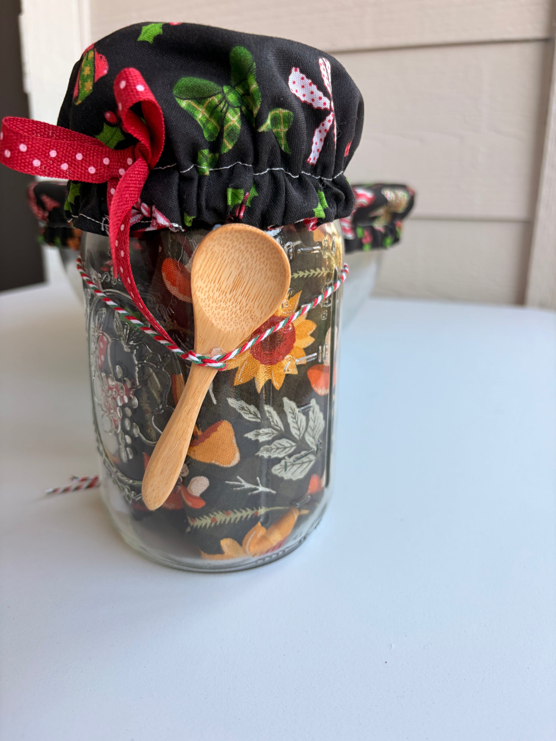 This large mason jar makes a unique Christmas gift for the baking guru. The large mason jar has its own lovely fabric cover on it and inside the jar there are 3 different bowl covers with holiday theme prints. There are (2), large size bowl covers and (1) medium size bowl cover. There is a pretty bow attached to the top of the jar cover and a cute little wooden spoon adorns the front of the glass jar. All the jars may have a variation in the prints but they are similar in that they are a holiday print. These covers are reversible giving you more style options. The fabric and thread is 100% cotton. Wash them in warm water do no use bleach. Do not use in the oven or the microwave.